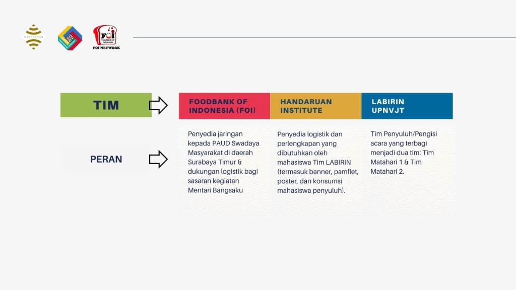Program Mentari Bangsaku melibatkan mahasiswa aktif dari Laboratorium Program Studi Hubungan Internasional UPN Veteran Jawa Timur (Labirin) sebagai bagian dari tim penyuluh. Tim penyuluh pertama (Tim Matahari 1) berbicara tentang edukasi gizi dan pendistribusian makanan. Tim penyuluh kedua (Tim Matahari 2) memberikan permainan edukasi serta bagaimana memilah sampah makanan.