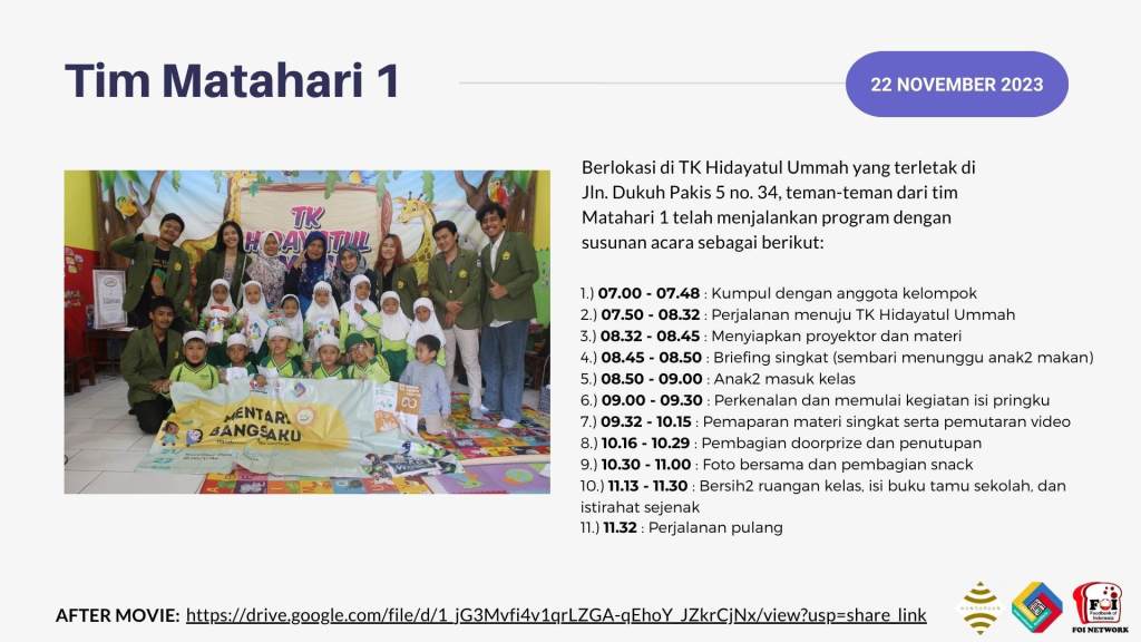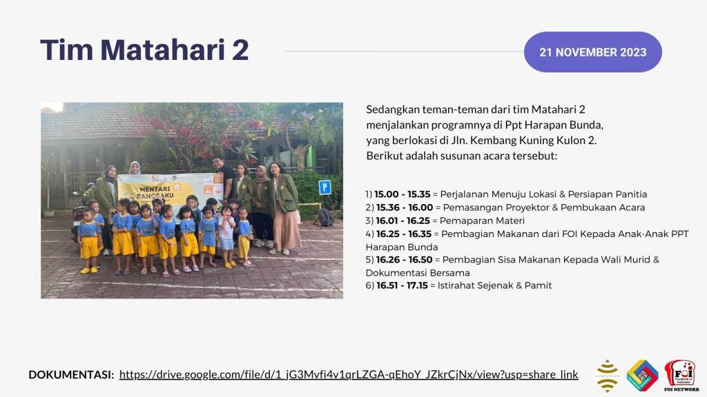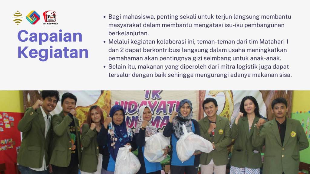 Program Mentari Bangsaku dilaksanakan pada tanggal 21-22 Nopember 2023 di daerah Surabaya Timur. Surabaya sebagai kota terbesar kedua di Indonesia memilki pertumbuhan masyarakat urban yang pesat sehingga memberikan potensi terhadapfood waste yang ada di kota ini.